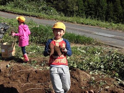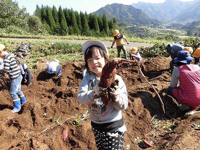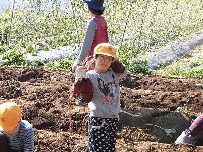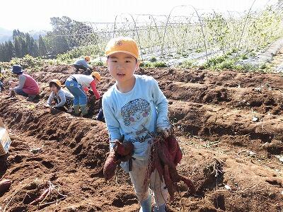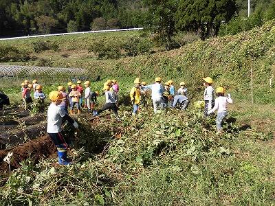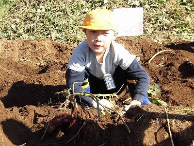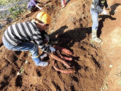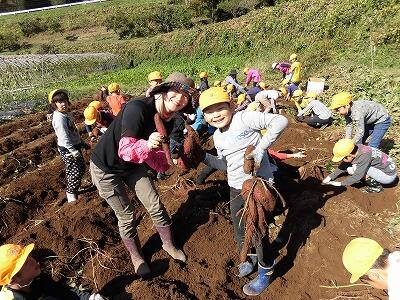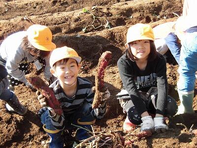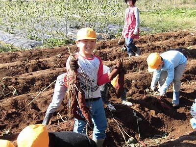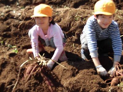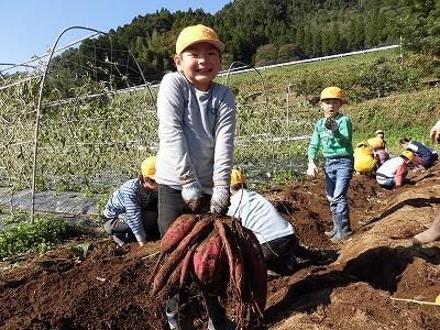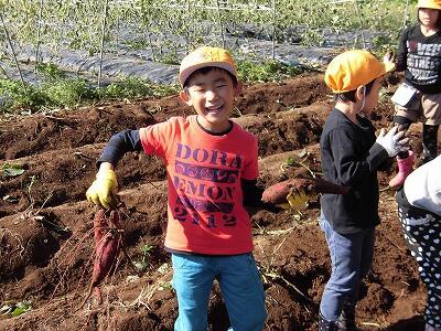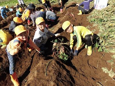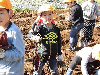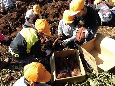 10月25日(水)にイモ掘り体験を行いました。イモのツルを保護者のご協力を得て刈り取った後、イモの収穫を行いました。大豊作に大満足の1年生と2年生です。