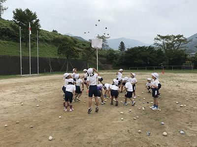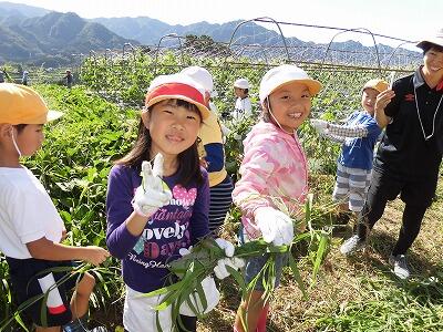 1・2年生でイモ畑の草抜きに行ってきました。夏の間に、元気よく伸びた雑草をみんなで力を合わせて抜いていきました。収穫が楽しみです。早く大きくなあれ!