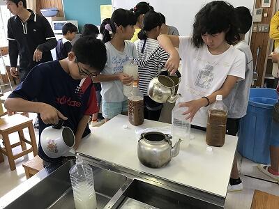 6年生は外部講師を招いて、EM菌の効果に関する授業を行いました。EM菌の効果を学習した後、EM菌を培養するペットボトルをつくりました。プールにまく準備をしていきます。