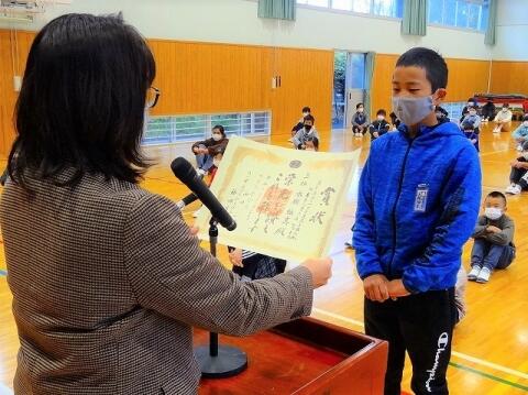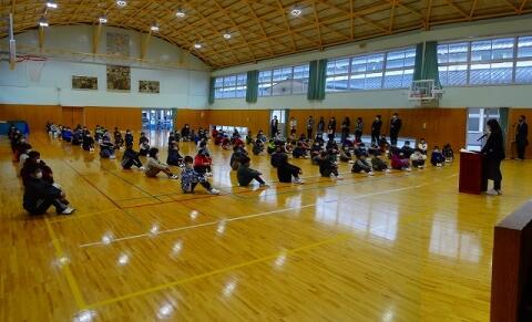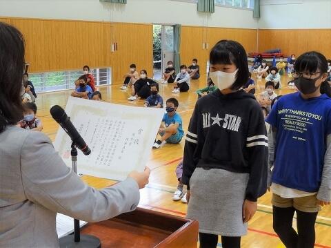 7月21日(水) 体育館で1学期の終業式を行いました。3年生、5年生の代表児童が1学期のを振り返って、タブレットを使った学習が楽しかったこと、あいさつや学習ノートを頑張ったことなどを発表しました。校長は、夏休みには3回黙とうをする日があることにふれ、平和について考えることの大切さを話しました。