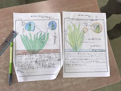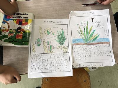 今日5年生は、6月に植えた稲の様子を観察にしに行きました。そこで観察したことを教室でまとめてみました。