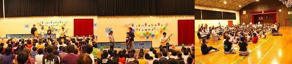 7月3日(木)、岩戸小学校でキャラバンコンサートがありました。これは、宮崎日日新聞社とMRT主催の「みんなに音楽♪大作戦!2014」という企画で、県内の学校や施設にプロの音楽を聞いてもらおうというものでした。岩戸小に来てくださったのは、ギタリストの大萩康司さんとカウンターテナーの藤木大地さんのおふたりで、どちらも宮崎県出身です。