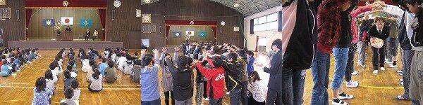3月1日金曜日、お別れ遠足がありました。今年も旧上岩戸小学校へバスに乗って行きました。4~6年生は上岩戸大橋前で降りて、上岩戸大橋から見える美しい景色を楽しみながら、歩いて上岩戸小まで行きました。上岩戸小学校は平成22年3月に閉校しましたが、地域の方々がきれいにされており、体育館や運動場を使って思いっきり遊ぶことができました。心配していた雨も昼までは降らず、クラスで鬼ごっこをしたり、ボール運動をしたりして遊びました。お弁当を食べた後は、岩戸っ子委員会の5年生の進行で、お別れ集会がありました。6年生全員にインタビューした将来の夢についてのクイズやじゃんけん列車、じゃんけんボーリングをして、全校で楽しい時間を過ごしました。