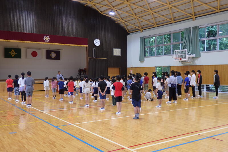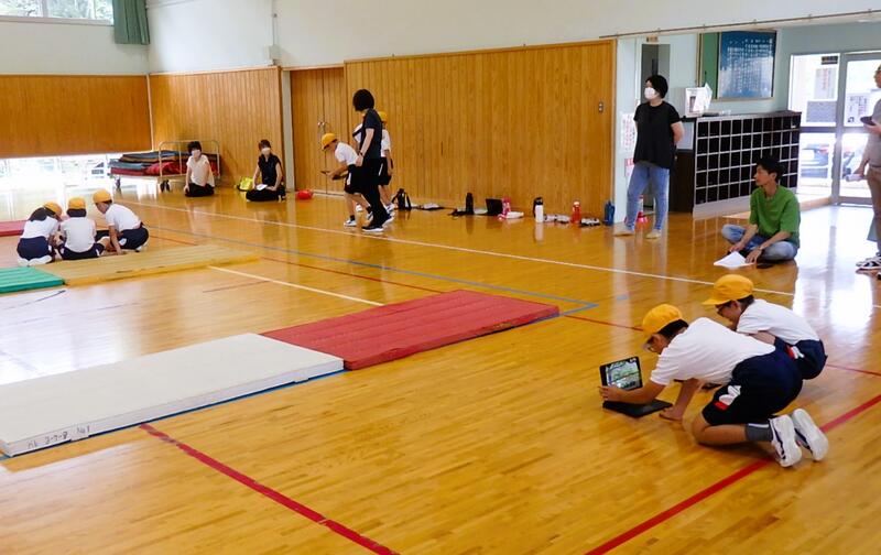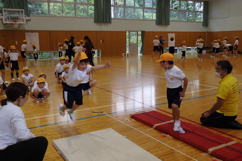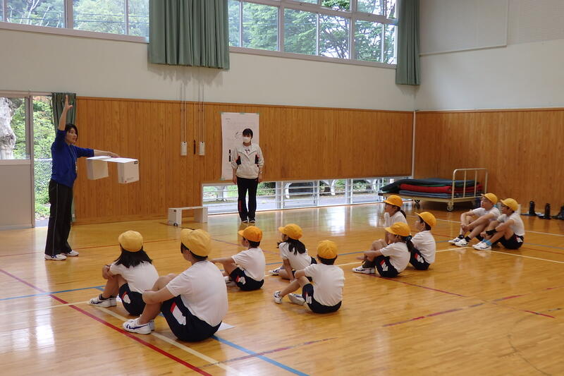 「反復横跳び」では、6年生が下級生と一緒にやり方を確認しました。
