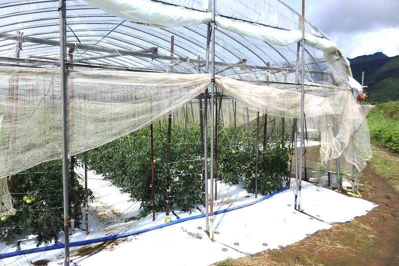 入り口をメッシュ素材の布で覆うのは、虫や鳥などから守り、安心・安全なトマトを育てる工夫の一つです。