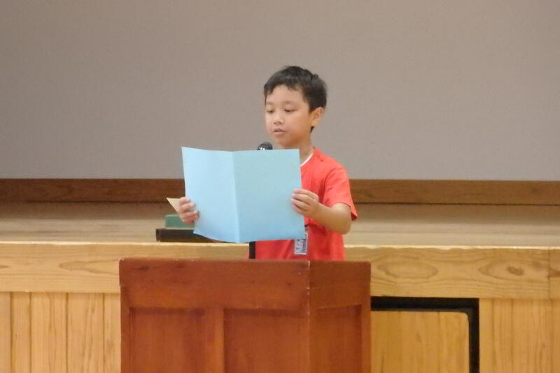 5年生が、暗唱した古典を全校児童の前で堂々と披露しました。