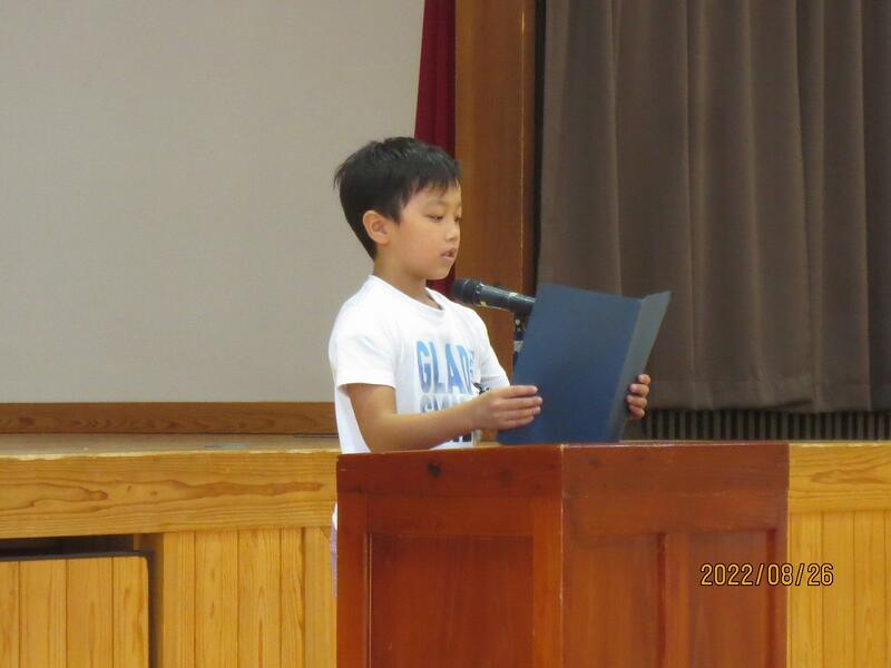 8月26日(金) 1校時に第2学期始業式を行い、2学期が始まりました。2年生と4年生の代表児童が2学期に頑張ることを発表しました。校長は、夏休み中の先生達の学びのことを伝え、2学期も子どもたちも先生たちも一緒に頑張っていこうと話しました。また、生徒指導部は「あいさつ運動」について、保健体育部は「決まり正しい生活習慣」について話しました。