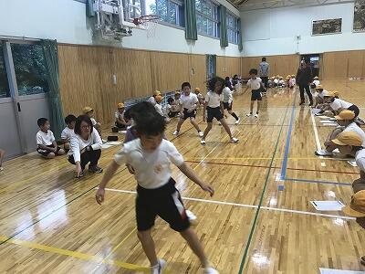 今日は、新体力テストのための全校体育が行われました。上学年と下学年がペアになり体力テストを行います。9日(水)が本番です。