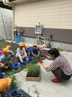 雨上がり、子どもたちが植えた花が、少しずつ大きく成長しています。夏頃には、花壇ぎっしりの花が咲くことでしょう。