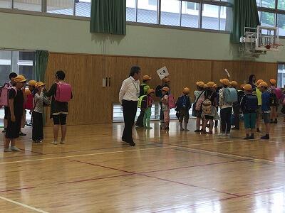本日、交通安全教室が行われました。駐在所のおまわりさんと交通安全指導員の2名に来ていただき指導していただきました。毎日通り慣れている道路ですが、横断歩道の歩き方を再度確認しました。ゴールデンウィークには多くの車が岩戸地区に来ますので、交通安全に気をつけるようにご家庭でもご指導ください。