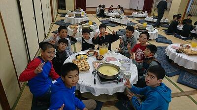 2日目、朝食の様子です。坂本大祈さんが食事のあいさつをを行いました。みんな元気です。今日は自主研修です。
