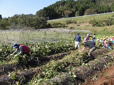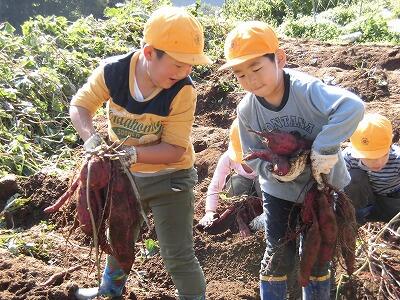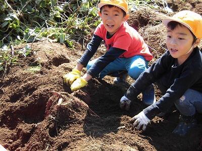 10月25日(水)にイモ掘り体験を行いました。イモのツルを保護者のご協力を得て刈り取った後、イモの収穫を行いました。大豊作に大満足の1年生と2年生です。