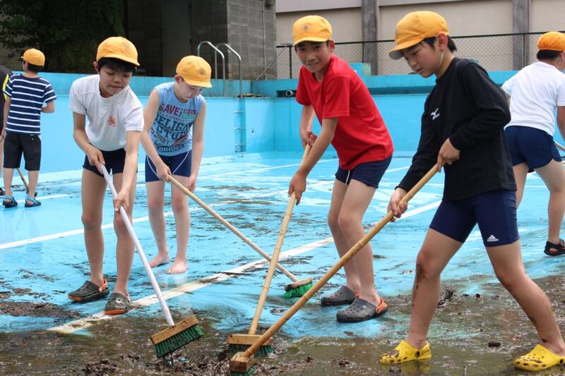 5月14日(木)に、4・5・6年生でプール清掃を行いました。4年生が、3・4校時に更衣室やプール周りの清掃を行い、5・6校時に、5・6年生がプール内や周りの清掃を行いました。写真からもわかる通り、自分たちや下級生が使うプールを自分たちの手で協力し、きれいにすることができました。清掃後の児童の表情からは、充実した感じがうかがえました。
