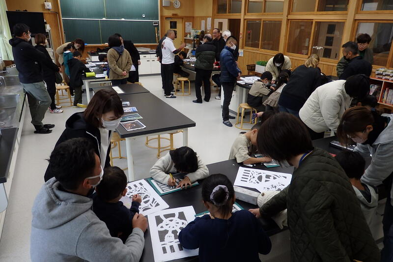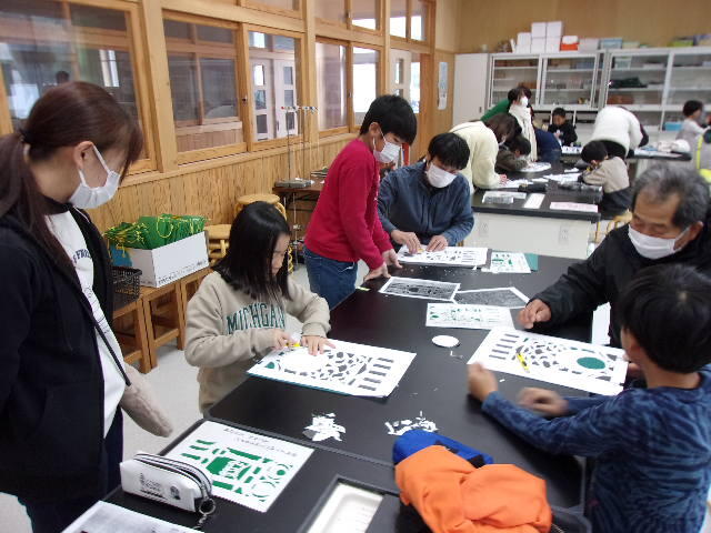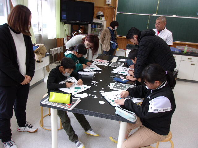 3年生と4年生は、夜神楽で奉仕者(ほしゃどん)が舞う舞台・神庭(こうにわ)の四方に飾られる切り絵のような「彫り物(えりもの)」づくりを行いました。
