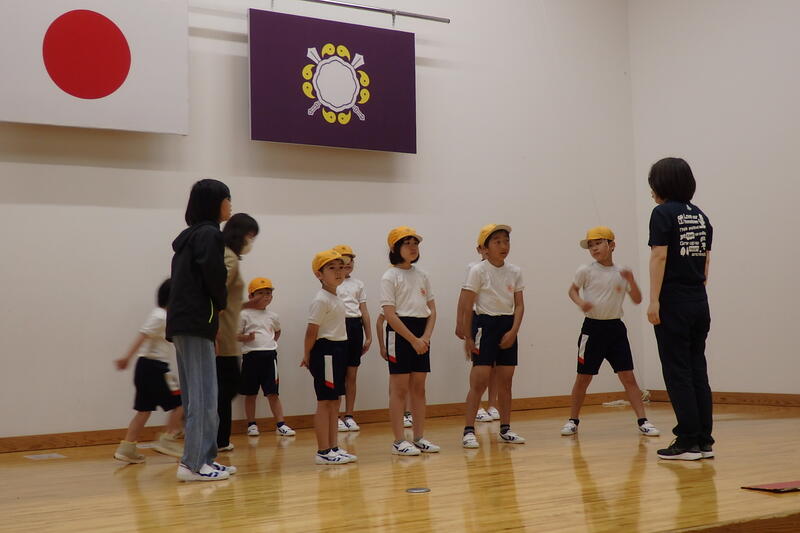 「反復横跳び」では、6年生が下級生と一緒にやり方を確認しました。