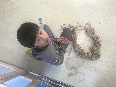 12月12日(水)3年生は図工の時間に巨大な蜘蛛の巣を作りました。ひもひもワールドの一場面です。