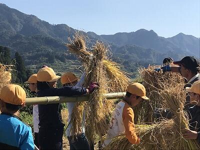 10月24日(水)5年生の稲刈り体験が行われました。前日降った雨のため、午後からの作業になりましたが、秋晴れの元、5年生で刈り取りと天日干しの作業を行いました。初めての体験で貴重な時間となりました。