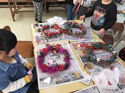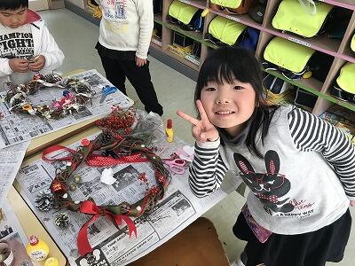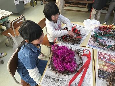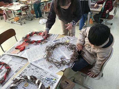 本日、1年生はイモのツルでつくったリース作りを行いました。工夫をしながら頑張ってつくっていました。素晴らしい作品ができました。