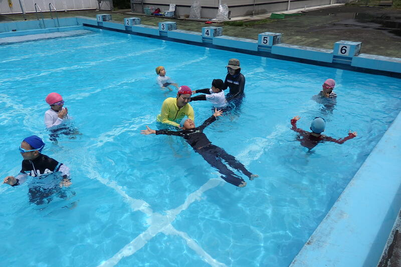 3・4年生も水の中で浮く練習をし、ペットボトルを使って命を守る方法を学びました。