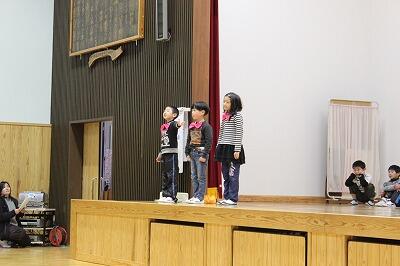 1年生22名による劇が熱演されました。全員が登場して、自分の得意なところを元気よく表現する姿に引き込まれる劇でした。