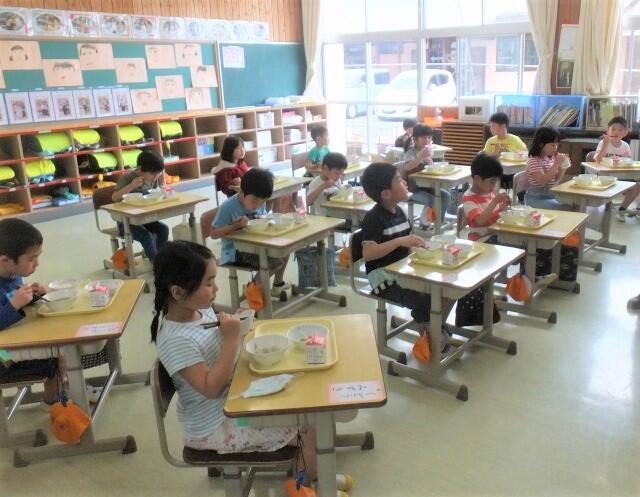 理科室での授業にも元気いっぱい!給食もみんな前を向いて食べました。