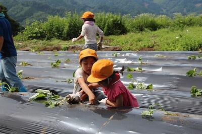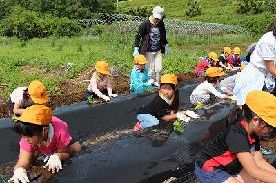 本日、1・2年生は芋の苗植え体験を行いました。天候に恵まれて豊かな体験を行うことができました。大きくなるのが楽しみです。
