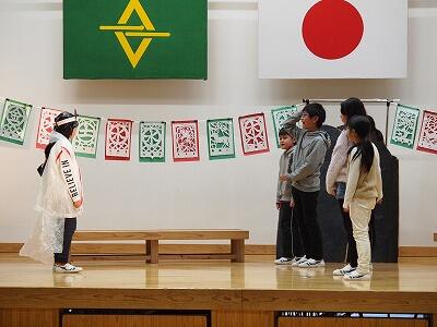 4年生はこれまで総合的な学習の時間で調べてきた岩戸の神話や伝承を劇にしました。「新・天岩戸伝説」を発表しました。「えりもの」も手作りでステージを飾りました。