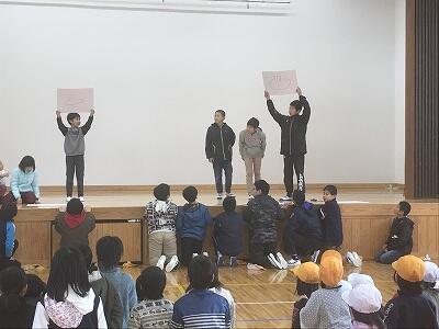 3月1日(金)お別れ集会が体育館で行われました。岩戸っ子委員会の司会でサイレントゲームやじゃんけんボーリングを行いました。その後、6年生が各学年と対決ゲームをしてくれました。工夫があってどの学年にも楽しめるものになっていました。さすが6年生ですと思わせる内容でした。