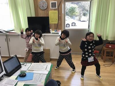2月4日の学習発表会に向けて各学年練習を行っています。昼休みに練習の成果を職員室に来て披露してくれました。1年生です。