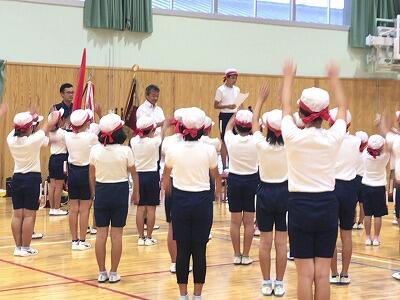 今日の全体練習は雨天のため体育館練習となりました。全体練習も3回目とあってスムーズに行動することが増えてきました。閉会式、エールの交換、応援の練習が行われました。今日の校長先生の評価は80点。確実にステップアップしている様子が見えました。