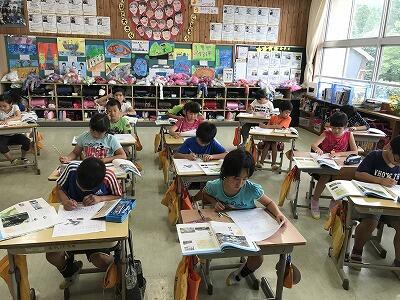 6年生は総合的な学習の時間を使って、岩戸の歴史について調べています。今日は職場体験学習の中学生の先輩たちも一緒に学習です。