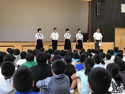 本日から2日間、高千穂中学校の生徒さんたちが岩戸小学校で職場体験を行います。4名の生徒さんは、全校集会で自己紹介をしてくれました。2日間の体験を頑張っています。