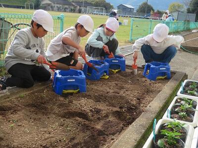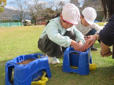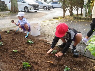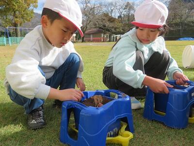 1年生が生活科でチューリップの球根を植えました。朝顔を育てていた鉢に一人2個ずつ球根を植えました。球根のとがった方が上になるのを確認しながら、優しく土をかけていました。何色の花が咲くかを楽しみに、毎日水やりを頑張るとはりきっていました。