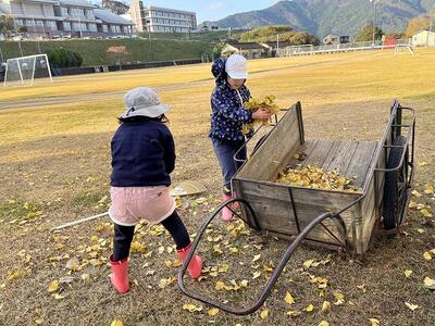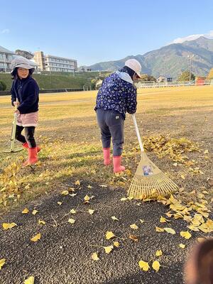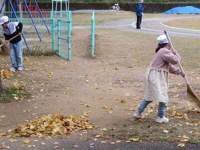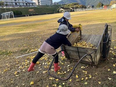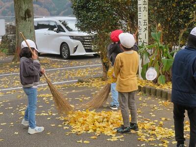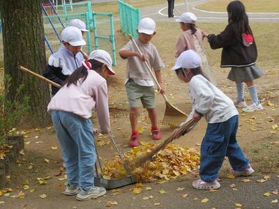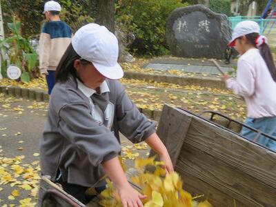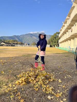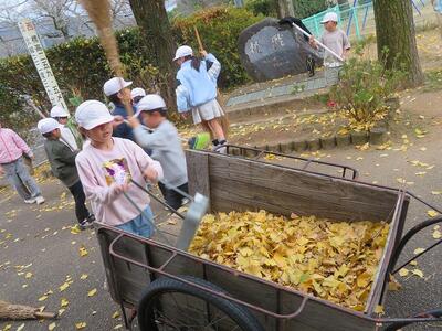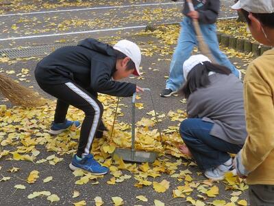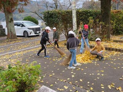 12月2日(火)の放課後のこと。放課後子ども教室の時間に外で遊んでいた子どもたち。風が吹き、玄関前の銀杏の葉がたくさん散り始めました。すると、1年生や2年生が集まり、落ち葉をきれいにし始めました。あちらこちらからほうきや道具を見つけてきて、掃いたり集めたり、運んだりと自主的にきれいにしてくれました。大人が言わなくても、自分たちで考え、行動できた1・2年生の姿に感動しました。すてきな子どもたちが育っている宮水小学校です!