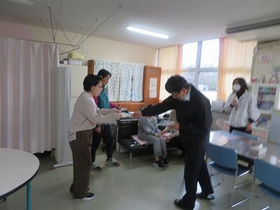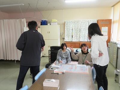12月3日(水)にアナフィラキシー対応研修を行いました。まず全体で研修内容を確認した後、職員の役割分担を行い、「シミュレーション形式」で訓練を行いました。今回は、児童が花壇付近で蜂に刺され、保健室に連れて行った後にアナフィラキシーの状態になった場合に、どのような対応を行うかという内容でした。放送で今回の事案が発生したことが知らされると職員が保健室に集まりました。そこで教頭がリーダーとなり、アクションカードを用いて、それぞれが対応にあたりました。今回は、西臼杵消防組合とも連携を行い、訓練の電話をかけながらの対応を行いました。電話からの指示等を確認しながら、模擬のエピペンを使用し、状態が落ち着くまでの訓練でした。その後、それぞれの担当から課題が出され、次回の訓練までに改善していくことを確認しました。今回のような実践的な訓練を積み重ねることで、有事の際に、落ち着いて対応できることが期待できます。今後もこのような研修の機会を設けていきます。