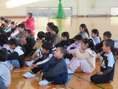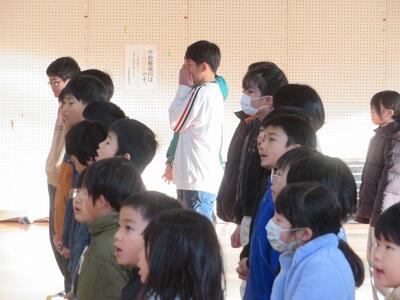 12月24日(水)に2学期の終業式を行いました。まずはじめに、児童を代表して3年生が発表を行いました。2学期の思い出の中で特に、町の音楽祭について発表しました。「初めてチャレンジしたウッドブロックに苦戦したが、練習を重ね、演奏できた。努力してできるようになることはうれしい。」という成長ぶりを発表してくれました。また、3学期や4年生に向けての決意も述べました。立派でした。校長の話では、始業式の日の話の内容であった「いのち」「あいさつ」「なかよく」「チャレンジ」について振り返りを行いました。子どもたちは挙手などしながら自分を振り返りました。最後に校歌を3番まで元気よく歌い、終業式は終了しました。