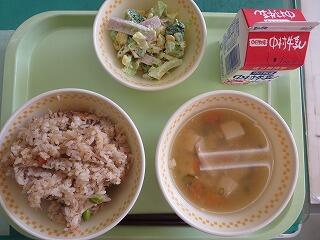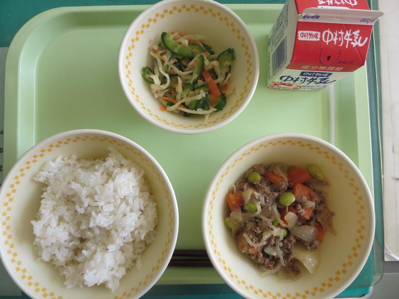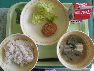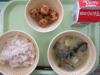 今日のメインは「枝豆と豆腐のミンチカツ」です。豆腐を使うことで、お肉だけのカツよりもヘルシーでふわふわな食感になっています。豆腐は大豆から作られる「赤の食品」で、みんなの体を作る大切なもとです。魚のみそ汁には冬が旬の「たら」が入っています。野菜の「緑の食品」もバランスよく入っているので、栄養満点です。午後の授業も元気に頑張れるよう、残さず食べましょう。