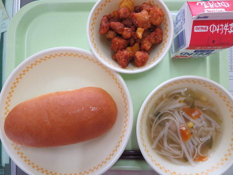 今日は韓国風の「ヤンニョムチキン」です!鶏肉に甘辛いタレを絡めており、ごはんやパンがすすむ味付けです。スープは「チンゲンサイとフォーのスープ」で、ベトナムの米粉の麺「フォー」が入っています。鶏肉は「赤の食品」、フォーやパンは「黄の食品」です。一つの献立で韓国とベトナムの料理を味わえる、グローバルな給食ですね。世界の味を楽しみながらいただきましょう。