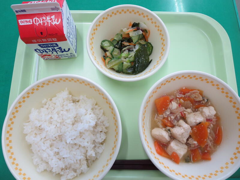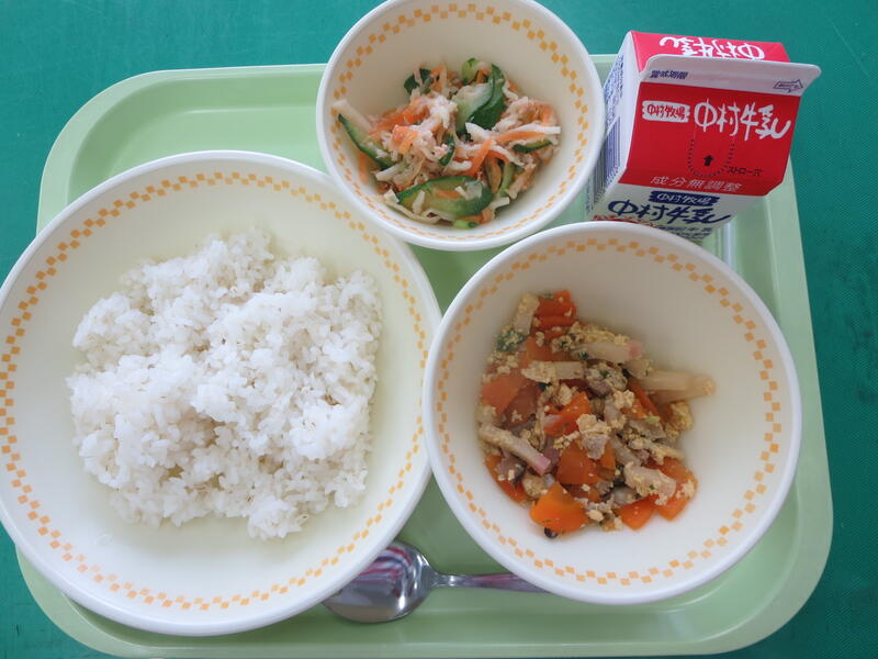 毎年 6 月4日 から10 日 までは、「歯 と口 の健康週間 」となっています。今週 は、毎日 の献立 の中 にかみかみメニューを入 れています。今日 のかみかみメニューは、切 り干 し大根 の酢の物 です。切 り干 し大根 は、大根 を日 に干 して作 ります。私 たちの郷土 、宮崎県 で多 く作 られています。切 り干 し大根 には、骨 を作 るもとになるビタミンDがたくさん含 まれています。今日 はかむことを意識 しながら食 べましょう。