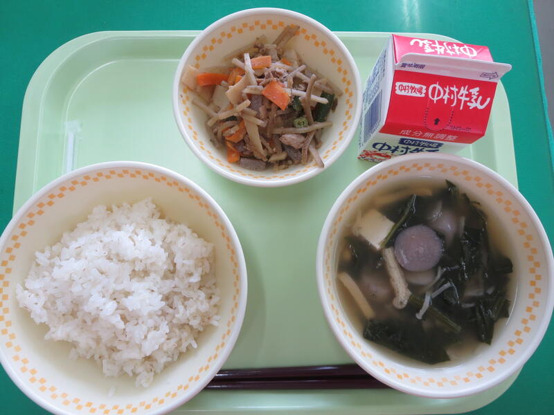 今日 は地産地消給食 の日 です。今日 の日之影町産 の食材 は高千穂牛肉 です。高千穂牛肉 はやわらかくて、とてもおいしいですよね。今日 はごぼうと一緒 にごはんに混 ぜて作 っていますよ。さて、今日 はごぼうについてのお話 です。ごぼうは食物繊維 を多 く含 んでいる食品 です。食物繊維 を多 く含 んだ食品 は固 いものが多 いので、特 によくかんで食 べる必要 があります。かむことは、歯 やあごを丈夫 にするだけでなく、脳 の働 きをよくしたり、肥満予防 につながったり、消化吸収 を高 めてくれたりします。今日 は、よくかむことを意識 して食 べましょう。