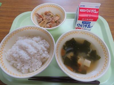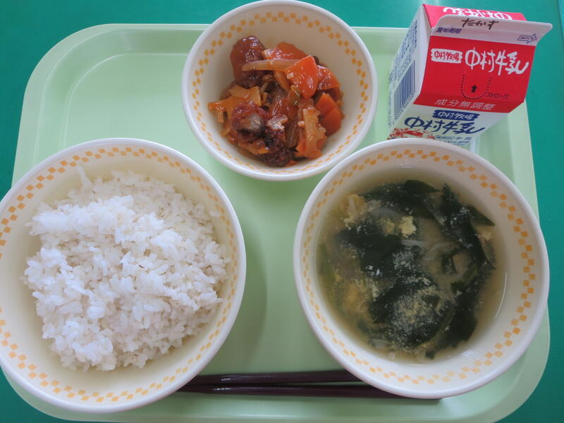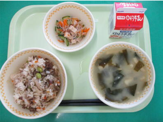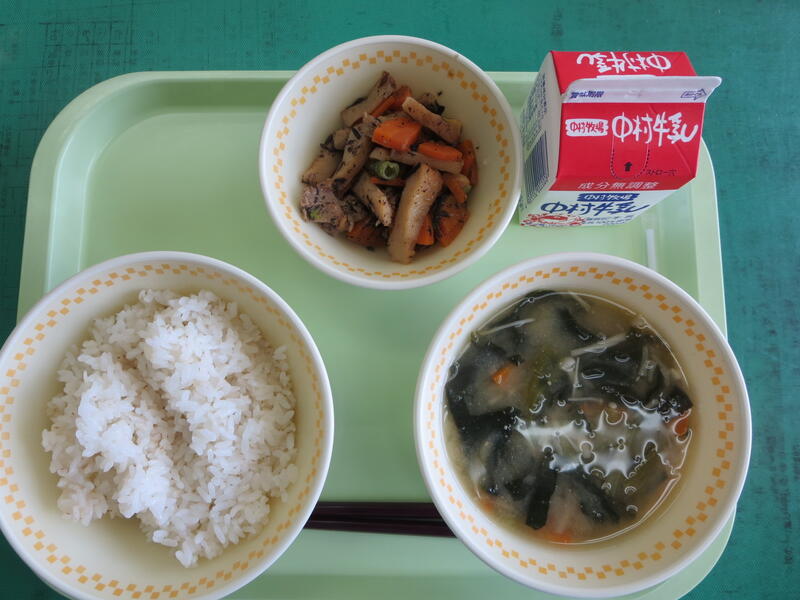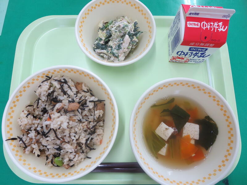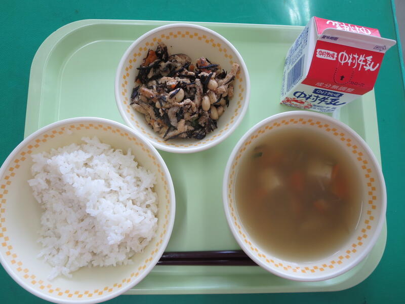 今日 はひじきについてのお話 です。ひじきには、骨 や歯 を丈夫 にするカルシウムや血液 を作 るもとになる鉄分 など、体 によい栄養 がたくさん含 まれています。また、食物繊維 も多 く含 まれていて、おなかの調子 をよくする働 きもあります。今日 はひじきをごはんに混 ぜたひじきごはんです。おいしく食 べてくださいね。