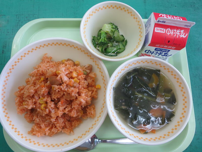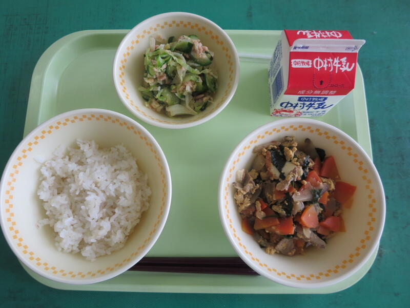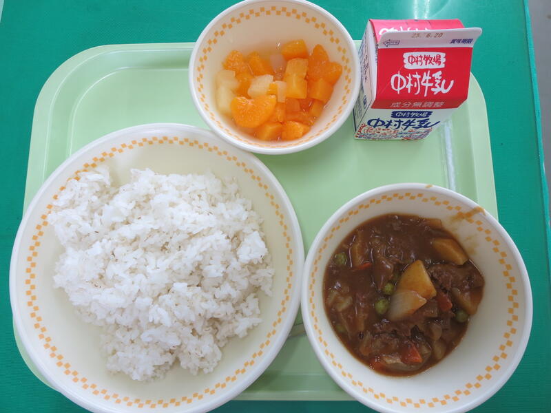 今日 は地産地消給食 の日 です。地産地消 の食材 は、高千穂牛肉 です。この高千穂牛肉 をふんだんに使 って、今日 はドライカレーを作 りました。ドライカレーは、いつものカレーライスとは少 し違 って、水分 が少 ないのが特徴 です。そのため、スプーンですくいやすく、ご飯全体 に味 がしっかり絡 みます。給食室 では、たまねぎやにんじん、ピーマンなどたくさんの野菜 を細 かく刻 んで、高千穂牛肉 とじっくり炒 めました。野菜 の甘 みとカレーのスパイシーな香 りが食欲 をそそりますね。残 さず食 べて午後 からの授業 も元気 にがんばりましょう。