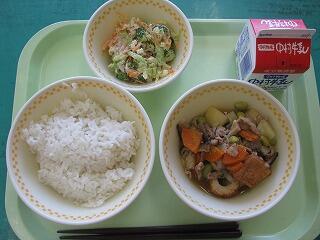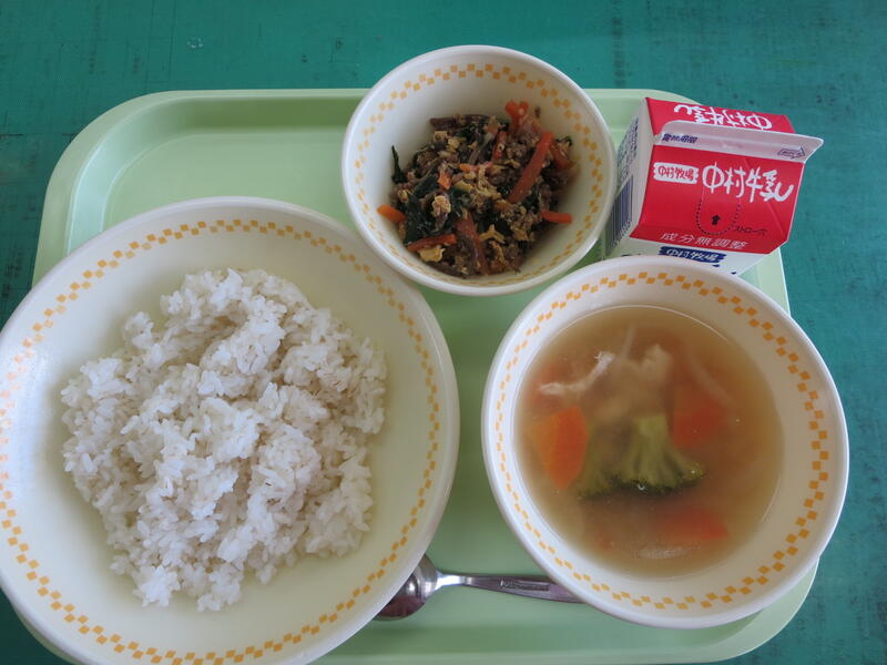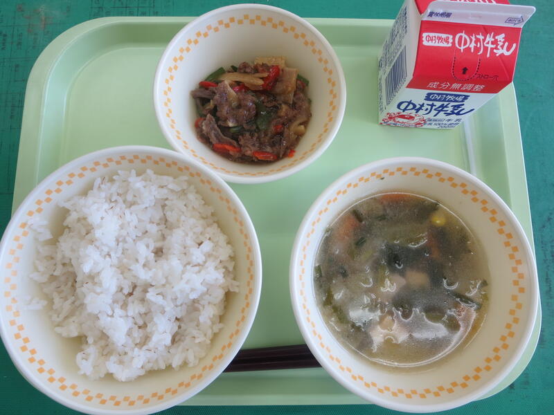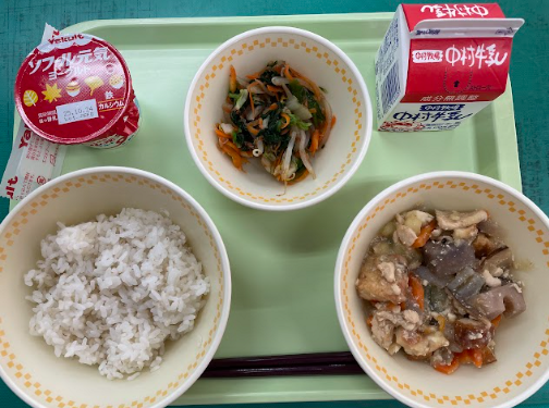 今日は地産地消給食の日です。今日の地産地消給食の食材は、高千穂牛肉です。高千穂牛肉は、体のもととなるたんぱく質が豊富で、みなさんの成長に欠かせません。特に、鉄分の吸収率が高く、貧血予防や集中力アップに役立ちます。また、免疫力といって、病気にかかりにくい力を保つ亜鉛という栄養素も多く含まれています。みんなが元気に、強く成長していくための大切な栄養素がたくさん含まれていますね。残さず食べて元気な体を作りましょう。