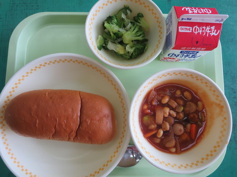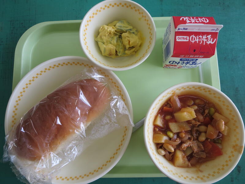 今日のポークビーンズに入っているじゃがいもは、3年生が2年生の時に、環境整備員の中内さんと一緒に植えて、2年生が収穫したものです。おいしくいただきましょう。