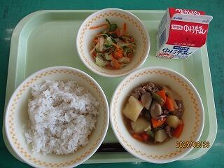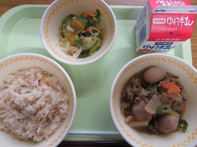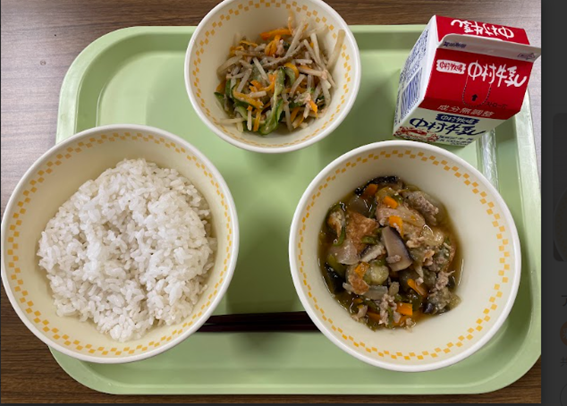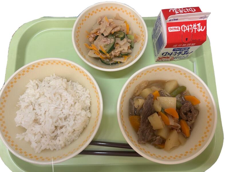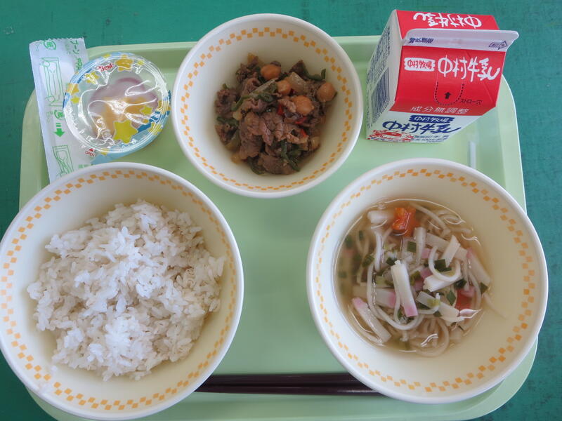 今日は地産地消給食の日です。今日の地産地消の食材は高千穂牛肉です。生産者の方が、心を込めて大切に育てた高千穂牛です。命や自然の恵みに感謝をしながらいただきましょう。今日は春雨の酢の物に入っている春雨についてのお話です。春雨は、主に豆やじゃがいも、さつまいもなどのでんぷんから作られています。このでんぷんを水で練って、細い穴から熱湯に押し出して作られます。豆のでんぷんから作られた春雨はコシが強いのが特徴で、じゃがいもやさつまいものでんぷんから作られた春雨はもちもちしています。春雨が出た時はつるつるとした食感を楽しみながら食べてみてくださいね。