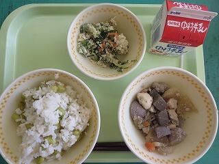 今日のメインは、味がしっかり染みた「関東煮(かんとうに)」です 。関東煮とは、いわゆる「おでん」のことで、だいこん、にんじん、こんにゃくなど、冬に美味しい食材がたっぷり使われています 。小さいおかずの「白和え」に入っている「ごま」には骨を強くするカルシウムが含まれています 。枝豆ごはんの彩りも楽しみながら、体の中からぽかぽかと温まりましょう 。