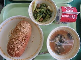 " 今日のスープには、アルファベットの形をしたABCマカロニが入っています。マカロニは、デュラムセモリナという粘りの強い小麦粉から作られ、脳のエネルギー源になる炭水化物を多く含んでいます。また、揚げパンに使われているきな粉は、大豆を煎って粉にしたものです。大豆の栄養素がぎゅっと濃縮されており、体をつくるたんぱく質や骨を丈夫にする無機質を効率よく摂ることができます。