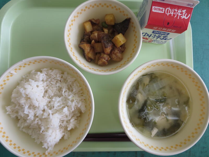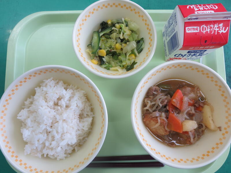 " 今日は地産地消給食の日です。西臼杵が誇るブランド牛である高千穂牛を使った贅沢な肉じゃがです。地元で育った食べ物をいただくことは、動植物の命への感謝や、作ってくれた人への感謝を知るとともに、新鮮で栄養たっぷりの食事をとることにもつながります。牛肉には鉄分が多く含まれていて、血液を元気にする働きがあります。地元の恵みをしっかり味わってくださいね。