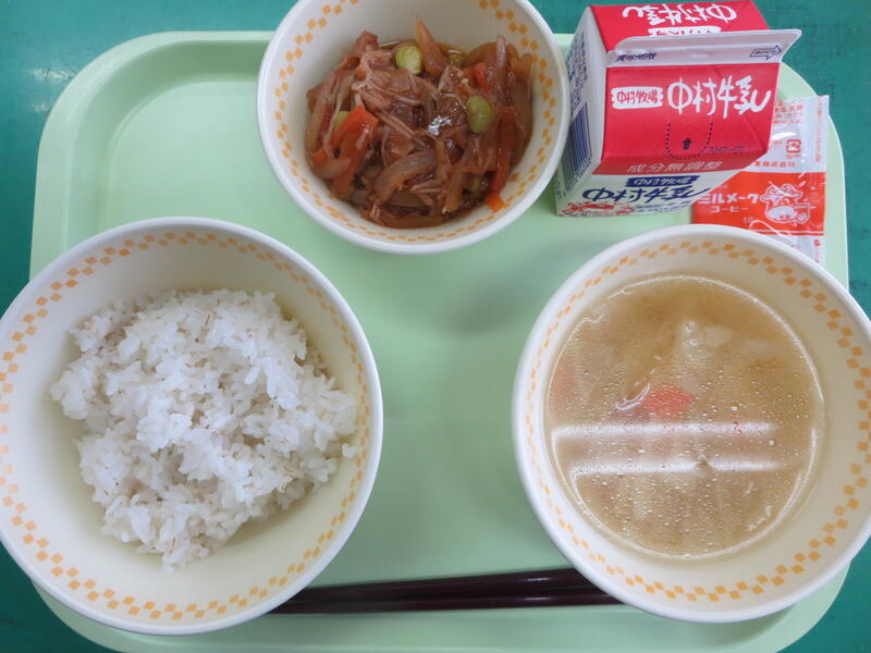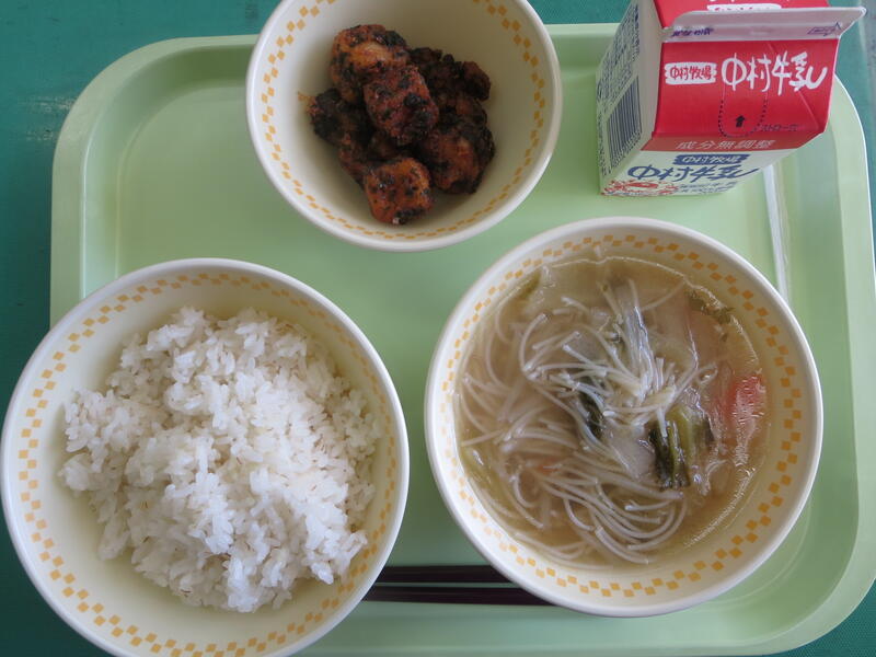 今日は韓国風の「ヤンニョムチキン」です!鶏肉に甘辛いタレを絡めており、ごはんやパンがすすむ味付けです。スープは「チンゲンサイとフォーのスープ」で、ベトナムの米粉の麺「フォー」が入っています。鶏肉は「赤の食品」、フォーやパンは「黄の食品」です。一つの献立で韓国とベトナムの料理を味わえる、グローバルな給食ですね。世界の味を楽しみながらいただきましょう。