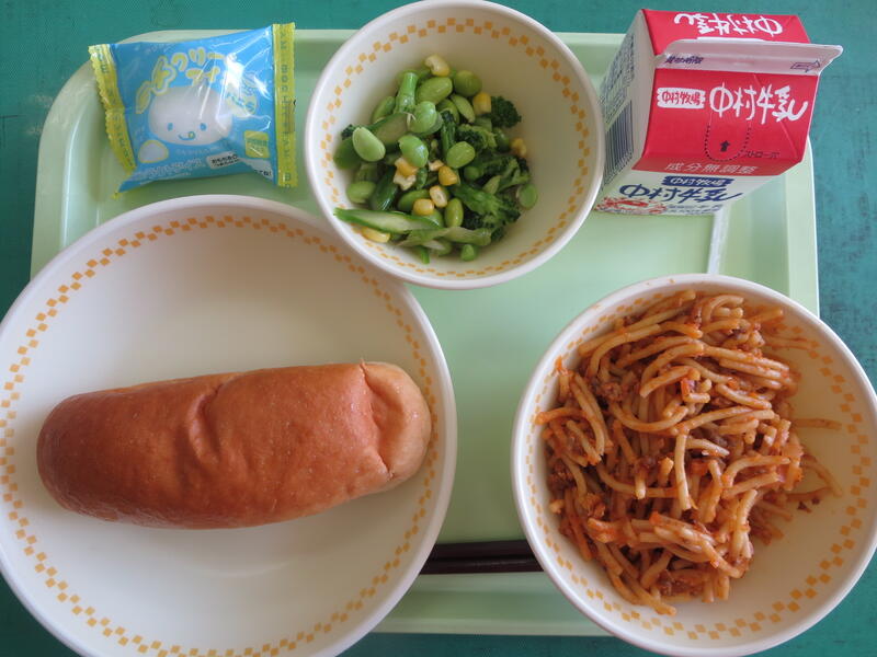 今日はリクエスト給食の、米粉パンとスパゲティミートソースを献立に取り入れました!"